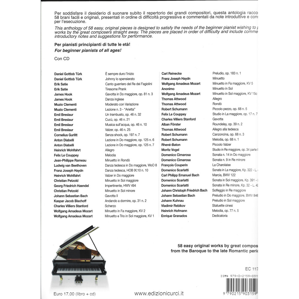 • Per soddisfare il desiderio di suonare subito il repertorio dei grandi compositori, questa antologia raccoglie 58 brani facili e originali, presentati in ordine di difficoltà progressiva e commentati da note introduttive e consigli per l’esecuzione.